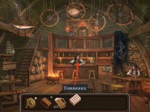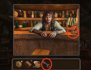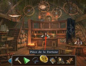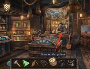 - Entrez dans le magasin, prenez la pièce, le pirate vous donnera la clé de cave.