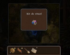 - Placez les cristaux de mer, calice de rituel, l’eau de perle et les fragments de carte sur le parchemin.