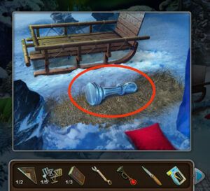 - Placez la carotte sur le bonhomme de neige, prenez la pièce en bois et la clef.