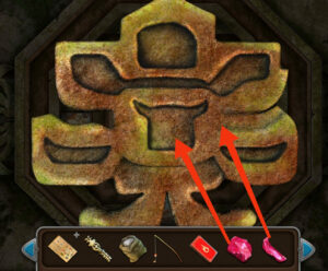 - Retournez au village, placez la chevalière sur la serrure de la porte, terminez le puzzle pour ouvrir la porte. Réorganisez les briques pour créer le motif désiré c’est le motif sur le pilier.