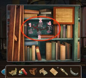 - Retournez à la bibliothèque, cherchez les chiffres qui correspondent à l’ordre des insectes sur la serrure de la porte.