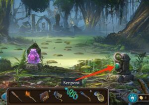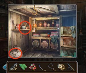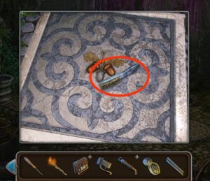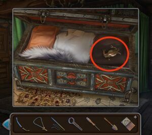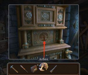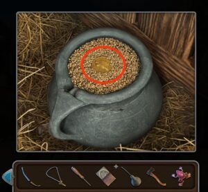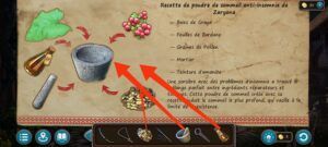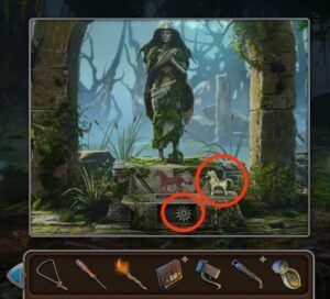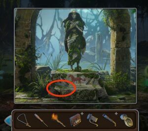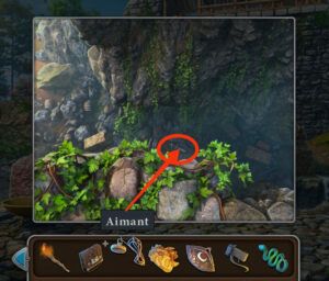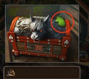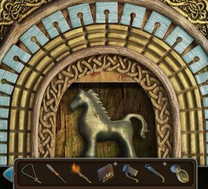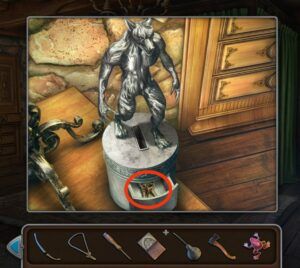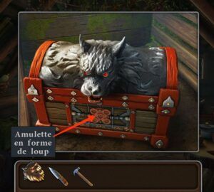 - Déplacez le vase, prenez l’amulette en forme de loup.