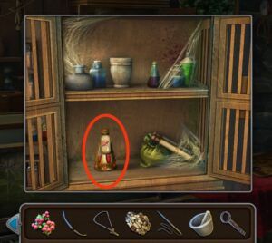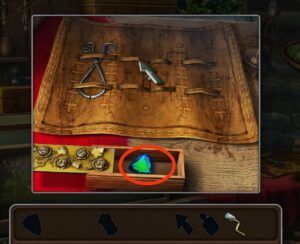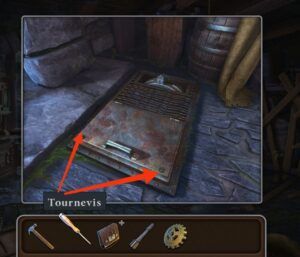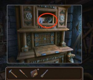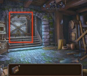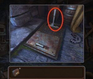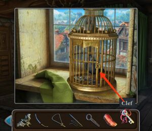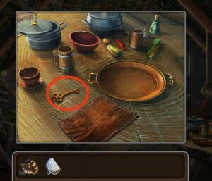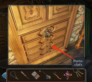 - Retournez dans la chambre de la sorcière, placez la pièce dans la cache, prenez la porte-clefs.