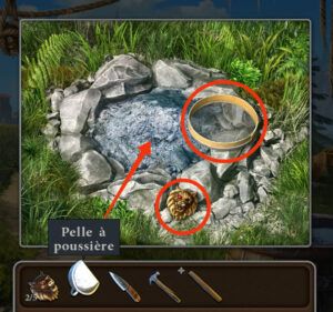 - Utilisez le tamis et la pelle à poussière, pour trouver la pierre précieuse.