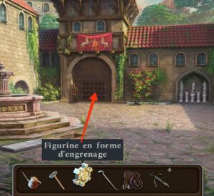 - Placez les figurines en forme d’engrenage sur la serrure du portail, terminez le puzzle pour l’ouvrir.